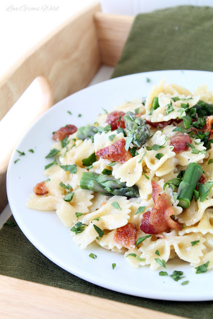 Cook pasta according to package directions. Meanwhile, cook bacon in a skillet over medium heat until crisp. Remove bacon from skillet onto paper towels to drain. Once bacon is cool, crumble and set aside. Melt butter in a Dutch oven over medium heat and saute garlic 30 seconds – 1 minute until tender. Stir in the cream, salt, pepper, and nutmeg and bring to a boil. Reduce heat and simmer, uncovered, for 3-5 minutes. Stir the Parmesan into the sauce until all Parmesan is melted and sauce is thickened. Remove from heat. Drain the pasta and add to the sauce. Add the bacon, asparagus, and parsley and stir to combine. Sprinkle with additional parsley and Parmesan for garnish, if desired and serve immediately.