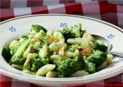 5. In a saute pan, add 6 Tbs of EV olive oil and make it hot.  Add the garlic and the peperoncino. Once the garlic turns golden, pour the oil and the garlic over the Cavatelli. Mix and serve.